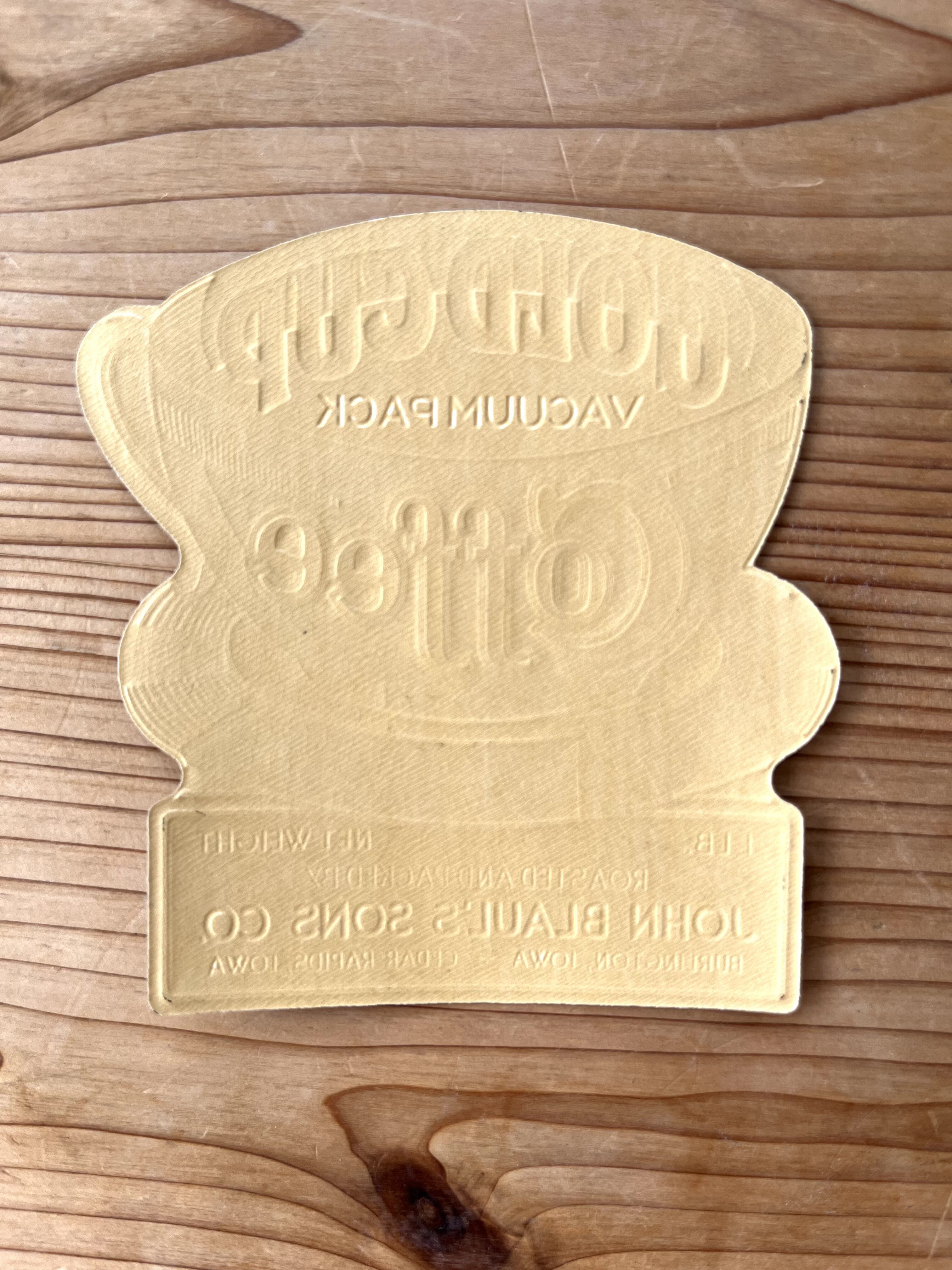 アイオワ州のジョン・ブラウルズ・サンズ社、コーヒー(ゴールドカップ真空パック 1パウンド)パッケージ用の紙製ラベルです。年代は不詳。