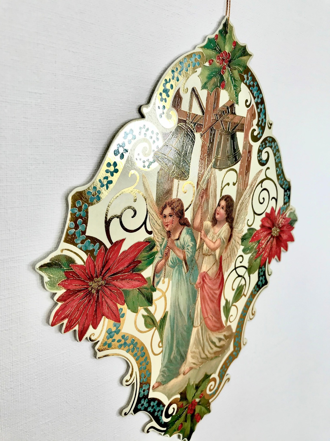 上部には穴があり細い金色の紐が通されていますので、すぐに飾ることができますよ。