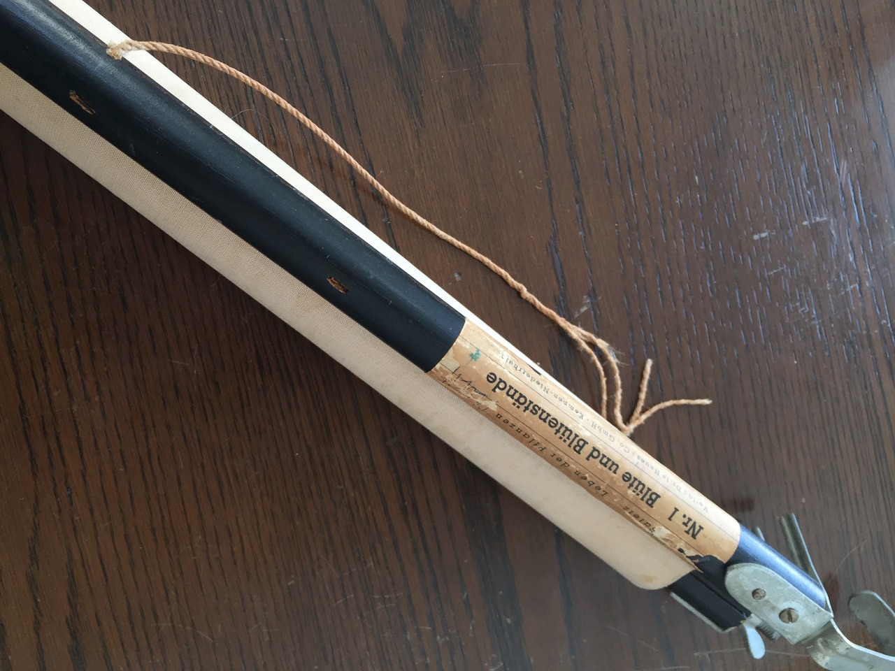 裏は布地で補強されており、上下に木製のバーが付いていますが、紐は切れています。